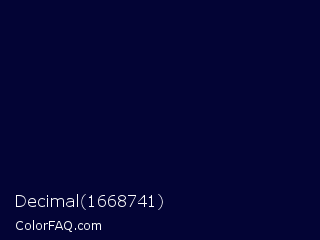 Decimal 1668741 Color is a very dark blue color and the nearest color is Black Rock #0d0332. Hex code #030435 and RGB value is rgb(3,4,53). In RGB color space, this color is composed of 1% red, 2% green, 21% blue, In CMYK color space, this color is composed of 94% cyan, 92% magenta, 0% yellow , 79% black , In HSL color space, this color has a hue angle of 239° , 89% saturation and 11% lightness.