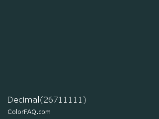 Decimal 26711111 Color is a very dark cyan color and the nearest color is Gable Green #163531. Hex code #1e3437 and RGB value is rgb(30,52,55). In RGB color space, this color is composed of 12% red, 20% green, 22% blue, In CMYK color space, this color is composed of 45% cyan, 5% magenta, 0% yellow , 78% black , In HSL color space, this color has a hue angle of 187° , 29% saturation and 17% lightness.
