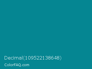 Decimal 109522138648 Color is a dark cyan color and the nearest color is Blue Chill #0c8990. Hex code #058692 and RGB value is rgb(5,134,146). In RGB color space, this color is composed of 2% red, 53% green, 57% blue, In CMYK color space, this color is composed of 97% cyan, 8% magenta, 0% yellow , 43% black , In HSL color space, this color has a hue angle of 185° , 93% saturation and 30% lightness.