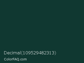 Decimal 109529482313 Color is a very dark cyan color and the nearest color is Gable Green #163531. Hex code #103831 and RGB value is rgb(16,56,49). In RGB color space, this color is composed of 6% red, 22% green, 19% blue, In CMYK color space, this color is composed of 71% cyan, 0% magenta, 13% yellow , 78% black , In HSL color space, this color has a hue angle of 170° , 56% saturation and 14% lightness.
