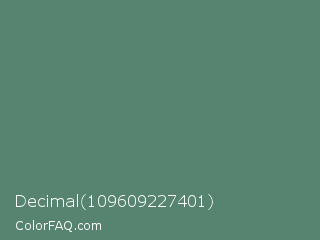 Decimal 109609227401 Color is a normal green color and the nearest color is Wintergreen Dream #56887d. Hex code #568471 and RGB value is rgb(86,132,113). In RGB color space, this color is composed of 34% red, 52% green, 44% blue, In CMYK color space, this color is composed of 35% cyan, 0% magenta, 14% yellow , 48% black , In HSL color space, this color has a hue angle of 155° , 21% saturation and 43% lightness.