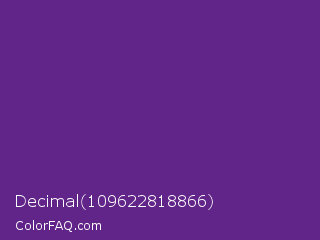 Decimal 109622818866 Color is a normal purple color and the nearest color is KSU Purple #512888. Hex code #612488 and RGB value is rgb(97,36,136). In RGB color space, this color is composed of 38% red, 14% green, 53% blue, In CMYK color space, this color is composed of 29% cyan, 74% magenta, 0% yellow , 47% black , In HSL color space, this color has a hue angle of 277° , 58% saturation and 34% lightness.