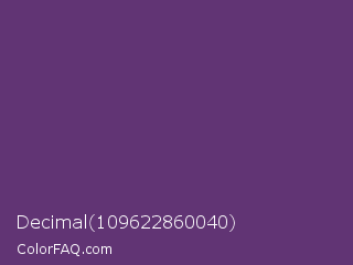 Decimal 109622860040 Color is a normal purple color and the nearest color is Imperial #602f6b. Hex code #613474 and RGB value is rgb(97,52,116). In RGB color space, this color is composed of 38% red, 20% green, 45% blue, In CMYK color space, this color is composed of 16% cyan, 55% magenta, 0% yellow , 55% black , In HSL color space, this color has a hue angle of 282° , 38% saturation and 33% lightness.