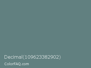 Decimal 109623382902 Color is a normal cyan color and the nearest color is Aurometalsaurus #6e7f80. Hex code #618080 and RGB value is rgb(97,128,128). In RGB color space, this color is composed of 38% red, 50% green, 50% blue, In CMYK color space, this color is composed of 24% cyan, 0% magenta, 0% yellow , 50% black , In HSL color space, this color has a hue angle of 180° , 14% saturation and 44% lightness.