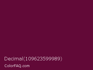 Decimal 109623599989 Color is a very dark rose color and the nearest color is Mulberry Wood #5c0536. Hex code #620937 and RGB value is rgb(98,9,55). In RGB color space, this color is composed of 38% red, 4% green, 22% blue, In CMYK color space, this color is composed of 0% cyan, 91% magenta, 44% yellow , 62% black , In HSL color space, this color has a hue angle of 329° , 83% saturation and 21% lightness.