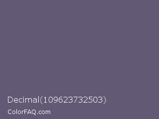 Decimal 109623732503 Color is a normal indigo color and the nearest color is Smoky #605b73. Hex code #625975 and RGB value is rgb(98,89,117). In RGB color space, this color is composed of 38% red, 35% green, 46% blue, In CMYK color space, this color is composed of 16% cyan, 24% magenta, 0% yellow , 54% black , In HSL color space, this color has a hue angle of 259° , 14% saturation and 40% lightness.