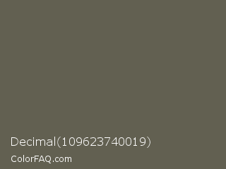Decimal 109623740019 Color is a normal yellow color and the nearest color is Soya Bean #6a6051. Hex code #626051 and RGB value is rgb(98,96,81). In RGB color space, this color is composed of 38% red, 38% green, 32% blue, In CMYK color space, this color is composed of 0% cyan, 2% magenta, 17% yellow , 62% black , In HSL color space, this color has a hue angle of 53° , 9% saturation and 35% lightness.