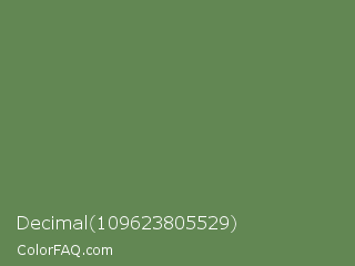 Decimal 109623805529 Color is a normal green color and the nearest color is Glade Green #61845f. Hex code #628753 and RGB value is rgb(98,135,83). In RGB color space, this color is composed of 38% red, 53% green, 33% blue, In CMYK color space, this color is composed of 27% cyan, 0% magenta, 39% yellow , 47% black , In HSL color space, this color has a hue angle of 103° , 24% saturation and 43% lightness.