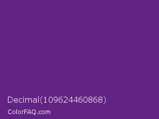 Decimal 109624460868 Color is a normal purple color and the nearest color is Eminence #6c3082. Hex code #632384 and RGB value is rgb(99,35,132). In RGB color space, this color is composed of 39% red, 14% green, 52% blue, In CMYK color space, this color is composed of 25% cyan, 73% magenta, 0% yellow , 48% black , In HSL color space, this color has a hue angle of 280° , 58% saturation and 33% lightness.