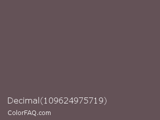 Decimal 109624975719 Color is a normal rose color and the nearest color is Zambezi #685558. Hex code #645257 and RGB value is rgb(100,82,87). In RGB color space, this color is composed of 39% red, 32% green, 34% blue, In CMYK color space, this color is composed of 0% cyan, 18% magenta, 13% yellow , 61% black , In HSL color space, this color has a hue angle of 343° , 10% saturation and 36% lightness.