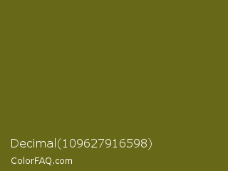 Decimal 109627916598 Color is a dark yellow color and the nearest color is Fern Frond #657220. Hex code #686918 and RGB value is rgb(104,105,24). In RGB color space, this color is composed of 41% red, 41% green, 9% blue, In CMYK color space, this color is composed of 1% cyan, 0% magenta, 77% yellow , 59% black , In HSL color space, this color has a hue angle of 61° , 63% saturation and 25% lightness.