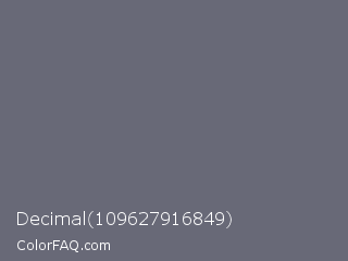 Decimal 109627916849 Color is a normal blue color and the nearest color is Nevada #646e75. Hex code #686977 and RGB value is rgb(104,105,119). In RGB color space, this color is composed of 41% red, 41% green, 47% blue, In CMYK color space, this color is composed of 13% cyan, 12% magenta, 0% yellow , 53% black , In HSL color space, this color has a hue angle of 236° , 7% saturation and 44% lightness.