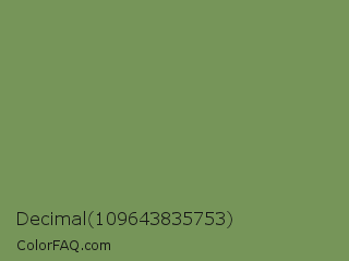 Decimal 109643835753 Color is a normal green color and the nearest color is Asparagus Green #7ba05b. Hex code #769559 and RGB value is rgb(118,149,89). In RGB color space, this color is composed of 46% red, 58% green, 35% blue, In CMYK color space, this color is composed of 21% cyan, 0% magenta, 40% yellow , 42% black , In HSL color space, this color has a hue angle of 91° , 25% saturation and 47% lightness.