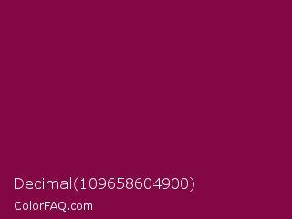 Decimal 109658604900 Color is a dark rose color and the nearest color is Rose Bud Cherry #800b47. Hex code #830744 and RGB value is rgb(131,7,68). In RGB color space, this color is composed of 51% red, 3% green, 27% blue, In CMYK color space, this color is composed of 0% cyan, 95% magenta, 48% yellow , 49% black , In HSL color space, this color has a hue angle of 330° , 90% saturation and 27% lightness.