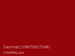 Decimal 109676927048 Color is a dark red color and the nearest color is Sangria #92000a. Hex code #940408 and RGB value is rgb(148,4,8). In RGB color space, this color is composed of 58% red, 2% green, 3% blue, In CMYK color space, this color is composed of 0% cyan, 97% magenta, 95% yellow , 42% black , In HSL color space, this color has a hue angle of 358° , 95% saturation and 30% lightness.