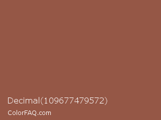 Decimal 109677479572 Color is a normal red color and the nearest color is Coconut #965a3e. Hex code #955746 and RGB value is rgb(149,87,70). In RGB color space, this color is composed of 58% red, 34% green, 27% blue, In CMYK color space, this color is composed of 0% cyan, 42% magenta, 53% yellow , 42% black , In HSL color space, this color has a hue angle of 13° , 36% saturation and 43% lightness.