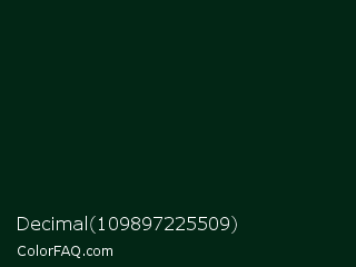 Decimal 109897225509 Color is a almost black green color and the nearest color is English Holly #022d15. Hex code #022615 and RGB value is rgb(2,38,21). In RGB color space, this color is composed of 1% red, 15% green, 8% blue, In CMYK color space, this color is composed of 95% cyan, 0% magenta, 45% yellow , 85% black , In HSL color space, this color has a hue angle of 152° , 90% saturation and 8% lightness.