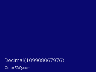 Decimal 109908067976 Color is a dark indigo color and the nearest color is Arapawa #110c6c. Hex code #090870 and RGB value is rgb(9,8,112). In RGB color space, this color is composed of 4% red, 3% green, 44% blue, In CMYK color space, this color is composed of 92% cyan, 93% magenta, 0% yellow , 56% black , In HSL color space, this color has a hue angle of 241° , 87% saturation and 24% lightness.