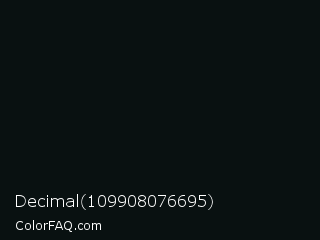 Decimal 109908076695 Color is a almost black cyan color and the nearest color is Woodsmoke #0c0d0f. Hex code #091111 and RGB value is rgb(9,17,17). In RGB color space, this color is composed of 4% red, 7% green, 7% blue, In CMYK color space, this color is composed of 47% cyan, 0% magenta, 0% yellow , 93% black , In HSL color space, this color has a hue angle of 180° , 31% saturation and 5% lightness.
