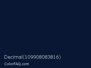 Decimal 109908083816 Color is a very dark blue color and the nearest color is Midnight #011635. Hex code #091734 and RGB value is rgb(9,23,52). In RGB color space, this color is composed of 4% red, 9% green, 20% blue, In CMYK color space, this color is composed of 83% cyan, 56% magenta, 0% yellow , 80% black , In HSL color space, this color has a hue angle of 220° , 70% saturation and 12% lightness.