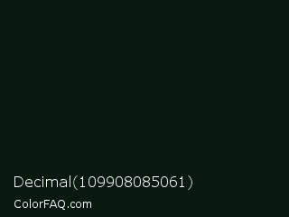 Decimal 109908085061 Color is a almost black green color and the nearest color is Black Bean #081910. Hex code #091911 and RGB value is rgb(9,25,17). In RGB color space, this color is composed of 4% red, 10% green, 7% blue, In CMYK color space, this color is composed of 64% cyan, 0% magenta, 32% yellow , 90% black , In HSL color space, this color has a hue angle of 150° , 47% saturation and 7% lightness.