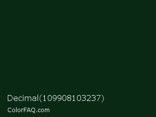 Decimal 109908103237 Color is a very dark green color and the nearest color is English Holly #022d15. Hex code #092915 and RGB value is rgb(9,41,21). In RGB color space, this color is composed of 4% red, 16% green, 8% blue, In CMYK color space, this color is composed of 78% cyan, 0% magenta, 49% yellow , 84% black , In HSL color space, this color has a hue angle of 143° , 64% saturation and 10% lightness.