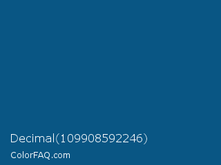 Decimal 109908592246 Color is a dark blue color and the nearest color is Venice Blue #055989. Hex code #095684 and RGB value is rgb(9,86,132). In RGB color space, this color is composed of 4% red, 34% green, 52% blue, In CMYK color space, this color is composed of 93% cyan, 35% magenta, 0% yellow , 48% black , In HSL color space, this color has a hue angle of 202° , 87% saturation and 28% lightness.