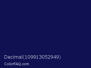Decimal 109913052949 Color is a very dark blue color and the nearest color is Gulf Blue #051657. Hex code #101153 and RGB value is rgb(16,17,83). In RGB color space, this color is composed of 6% red, 7% green, 33% blue, In CMYK color space, this color is composed of 81% cyan, 80% magenta, 0% yellow , 67% black , In HSL color space, this color has a hue angle of 239° , 68% saturation and 19% lightness.