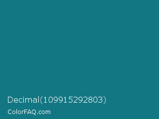 Decimal 109915292803 Color is a dark cyan color and the nearest color is Elm #1c7c7d. Hex code #137783 and RGB value is rgb(19,119,131). In RGB color space, this color is composed of 7% red, 47% green, 51% blue, In CMYK color space, this color is composed of 85% cyan, 9% magenta, 0% yellow , 49% black , In HSL color space, this color has a hue angle of 186° , 75% saturation and 29% lightness.