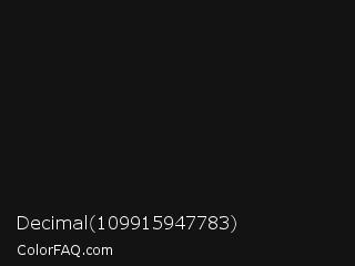 Decimal 109915947783 Color is a almost black red color and the nearest color is Licorice #1a1110. Hex code #141313 and RGB value is rgb(20,19,19). In RGB color space, this color is composed of 8% red, 7% green, 7% blue, In CMYK color space, this color is composed of 0% cyan, 5% magenta, 5% yellow , 92% black , In HSL color space, this color has a hue angle of 0° , 3% saturation and 8% lightness.
