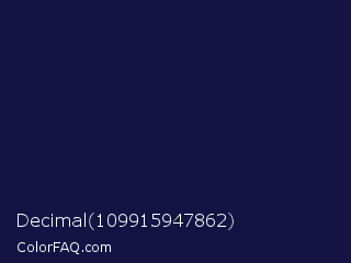 Decimal 109915947862 Color is a very dark indigo color and the nearest color is Bunting #151f4c. Hex code #141344 and RGB value is rgb(20,19,68). In RGB color space, this color is composed of 8% red, 7% green, 27% blue, In CMYK color space, this color is composed of 71% cyan, 72% magenta, 0% yellow , 73% black , In HSL color space, this color has a hue angle of 241° , 56% saturation and 17% lightness.
