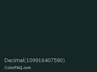 Decimal 109916407590 Color is a very dark cyan color and the nearest color is Dark Jungle Green #1a2421. Hex code #152626 and RGB value is rgb(21,38,38). In RGB color space, this color is composed of 8% red, 15% green, 15% blue, In CMYK color space, this color is composed of 45% cyan, 0% magenta, 0% yellow , 85% black , In HSL color space, this color has a hue angle of 180° , 29% saturation and 12% lightness.