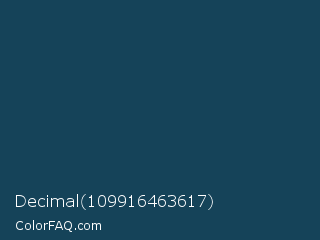 Decimal 109916463617 Color is a very dark blue color and the nearest color is Blue Dianne #204852. Hex code #154359 and RGB value is rgb(21,67,89). In RGB color space, this color is composed of 8% red, 26% green, 35% blue, In CMYK color space, this color is composed of 76% cyan, 25% magenta, 0% yellow , 65% black , In HSL color space, this color has a hue angle of 199° , 62% saturation and 22% lightness.