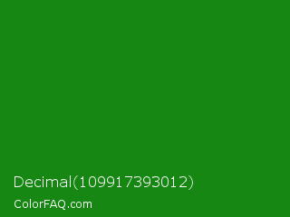 Decimal 109917393012 Color is a dark green color and the nearest color is India Green #138808. Hex code #168712 and RGB value is rgb(22,135,18). In RGB color space, this color is composed of 9% red, 53% green, 7% blue, In CMYK color space, this color is composed of 84% cyan, 0% magenta, 87% yellow , 47% black , In HSL color space, this color has a hue angle of 118° , 76% saturation and 30% lightness.