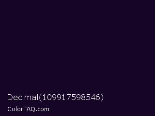 Decimal 109917598546 Color is a almost black purple color and the nearest color is Black Rock #0d0332. Hex code #170528 and RGB value is rgb(23,5,40). In RGB color space, this color is composed of 9% red, 2% green, 16% blue, In CMYK color space, this color is composed of 43% cyan, 88% magenta, 0% yellow , 84% black , In HSL color space, this color has a hue angle of 271° , 78% saturation and 9% lightness.