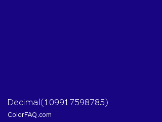Decimal 109917598785 Color is a dark indigo color and the nearest color is Deep Blue #220878. Hex code #170581 and RGB value is rgb(23,5,129). In RGB color space, this color is composed of 9% red, 2% green, 51% blue, In CMYK color space, this color is composed of 82% cyan, 96% magenta, 0% yellow , 49% black , In HSL color space, this color has a hue angle of 249° , 93% saturation and 26% lightness.