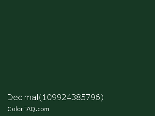 Decimal 109924385796 Color is a very dark green color and the nearest color is Phthalo Green #123524. Hex code #173824 and RGB value is rgb(23,56,36). In RGB color space, this color is composed of 9% red, 22% green, 14% blue, In CMYK color space, this color is composed of 59% cyan, 0% magenta, 36% yellow , 78% black , In HSL color space, this color has a hue angle of 144° , 42% saturation and 15% lightness.