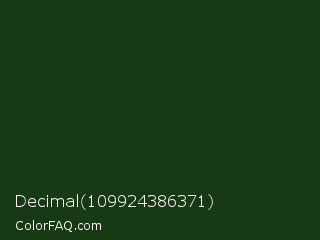 Decimal 109924386371 Color is a very dark green color and the nearest color is Palm Leaf #19330e. Hex code #173913 and RGB value is rgb(23,57,19). In RGB color space, this color is composed of 9% red, 22% green, 7% blue, In CMYK color space, this color is composed of 60% cyan, 0% magenta, 67% yellow , 78% black , In HSL color space, this color has a hue angle of 114° , 50% saturation and 15% lightness.