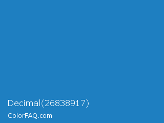 Decimal 26838917 Color is a normal blue color and the nearest color is Cyan Cornflower Blue #188bc2. Hex code #1e7fc1 and RGB value is rgb(30,127,193). In RGB color space, this color is composed of 12% red, 50% green, 76% blue, In CMYK color space, this color is composed of 84% cyan, 34% magenta, 0% yellow , 24% black , In HSL color space, this color has a hue angle of 204° , 73% saturation and 44% lightness.