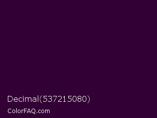 Decimal 537215080 Color is a very dark magenta color and the nearest color is Mardi Gras #350036. Hex code #320034 and RGB value is rgb(50,0,52). In RGB color space, this color is composed of 20% red, 0% green, 20% blue, In CMYK color space, this color is composed of 4% cyan, 100% magenta, 0% yellow , 80% black , In HSL color space, this color has a hue angle of 298° , 100% saturation and 10% lightness.