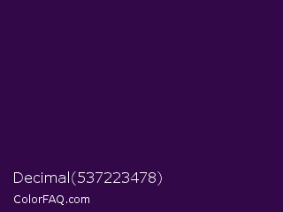 Decimal 537223478 Color is a very dark purple color and the nearest color is Valentino #350e42. Hex code #320848 and RGB value is rgb(50,8,72). In RGB color space, this color is composed of 20% red, 3% green, 28% blue, In CMYK color space, this color is composed of 31% cyan, 89% magenta, 0% yellow , 72% black , In HSL color space, this color has a hue angle of 279° , 80% saturation and 16% lightness.