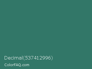 Decimal 537412996 Color is a normal cyan color and the nearest color is Myrtle Green #317873. Hex code #327768 and RGB value is rgb(50,119,104). In RGB color space, this color is composed of 20% red, 47% green, 41% blue, In CMYK color space, this color is composed of 58% cyan, 0% magenta, 13% yellow , 53% black , In HSL color space, this color has a hue angle of 167° , 41% saturation and 33% lightness.