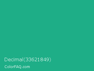 Decimal 33621849 Color is a normal cyan color and the nearest color is Mountain Meadow Crayola #1ab385. Hex code #1eae87 and RGB value is rgb(30,174,135). In RGB color space, this color is composed of 12% red, 68% green, 53% blue, In CMYK color space, this color is composed of 83% cyan, 0% magenta, 22% yellow , 32% black , In HSL color space, this color has a hue angle of 164° , 71% saturation and 40% lightness.