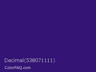 Decimal 538071111 Color is a dark indigo color and the nearest color is Persian Indigo #32127a. Hex code #331577 and RGB value is rgb(51,21,119). In RGB color space, this color is composed of 20% red, 8% green, 47% blue, In CMYK color space, this color is composed of 57% cyan, 82% magenta, 0% yellow , 53% black , In HSL color space, this color has a hue angle of 258° , 70% saturation and 27% lightness.