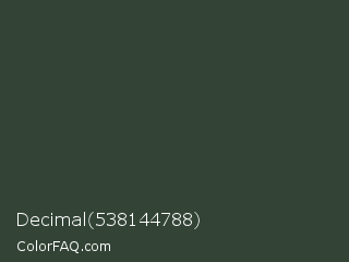 Decimal 538144788 Color is a dark green color and the nearest color is Kombu Green #354230. Hex code #334436 and RGB value is rgb(51,68,54). In RGB color space, this color is composed of 20% red, 27% green, 21% blue, In CMYK color space, this color is composed of 25% cyan, 0% magenta, 21% yellow , 73% black , In HSL color space, this color has a hue angle of 131° , 14% saturation and 23% lightness.