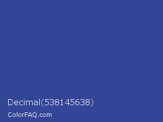 Decimal 538145638 Color is a normal blue color and the nearest color is Chambray #354e8c. Hex code #334596 and RGB value is rgb(51,69,150). In RGB color space, this color is composed of 20% red, 27% green, 59% blue, In CMYK color space, this color is composed of 66% cyan, 54% magenta, 0% yellow , 41% black , In HSL color space, this color has a hue angle of 229° , 49% saturation and 39% lightness.