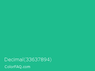 Decimal 33637894 Color is a normal green color and the nearest color is Mountain Meadow Crayola #1ab385. Hex code #1ebd8e and RGB value is rgb(30,189,142). In RGB color space, this color is composed of 12% red, 74% green, 56% blue, In CMYK color space, this color is composed of 84% cyan, 0% magenta, 25% yellow , 26% black , In HSL color space, this color has a hue angle of 162° , 73% saturation and 43% lightness.