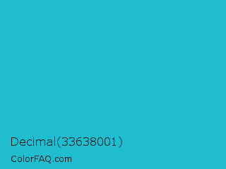 Decimal 33638001 Color is a normal cyan color and the nearest color is Java #1fc2c2. Hex code #1ebdcf and RGB value is rgb(30,189,207). In RGB color space, this color is composed of 12% red, 74% green, 81% blue, In CMYK color space, this color is composed of 86% cyan, 9% magenta, 0% yellow , 19% black , In HSL color space, this color has a hue angle of 186° , 75% saturation and 46% lightness.