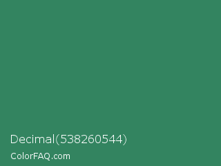 Decimal 538260544 Color is a normal green color and the nearest color is Sea Green #2e8b57. Hex code #338460 and RGB value is rgb(51,132,96). In RGB color space, this color is composed of 20% red, 52% green, 38% blue, In CMYK color space, this color is composed of 61% cyan, 0% magenta, 27% yellow , 48% black , In HSL color space, this color has a hue angle of 153° , 44% saturation and 36% lightness.