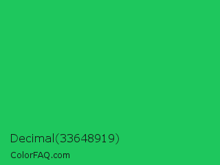 Decimal 33648919 Color is a normal green color and the nearest color is Malachite #0bda51. Hex code #1ec75d and RGB value is rgb(30,199,93). In RGB color space, this color is composed of 12% red, 78% green, 36% blue, In CMYK color space, this color is composed of 85% cyan, 0% magenta, 53% yellow , 22% black , In HSL color space, this color has a hue angle of 142° , 74% saturation and 45% lightness.